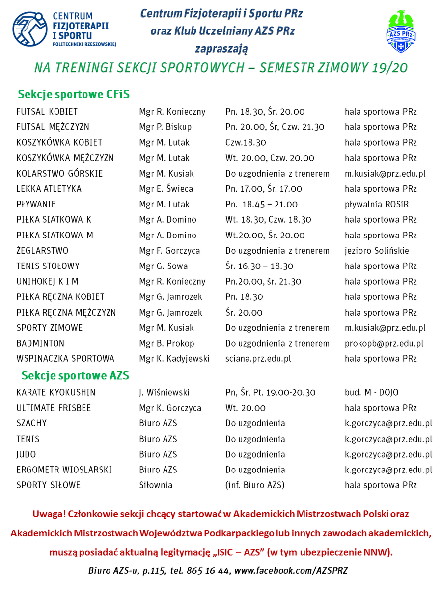 Serdecznie zapraszamy do udziału w sekcjach sportowych CFiS oraz AZS PRz. Masz doświadczenie w którejś z dyscyplin ? A może szukasz sposobu na aktywne spędzenie czasu ? Wystarczy przyjść na trening danej dyscypliny.
